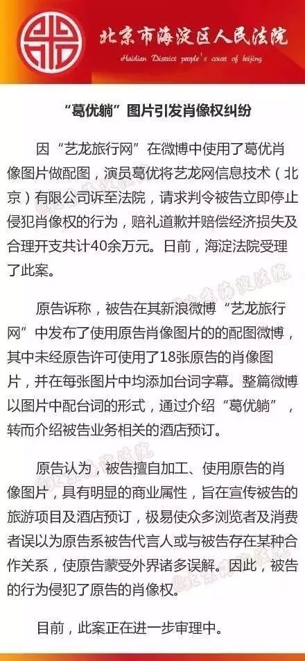 2016年12月,他将艺龙网信息技术(北京)有限公司诉至法院,后者因在官方微博中使用“葛优躺”表情作为配图,被法院判定“侵犯个人肖像权”,须赔礼道歉并赔偿相关经济损失40余万元。