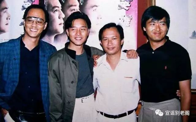 1991《纵横四海》片场,吴宇森(右二)给周润发和张国荣说戏