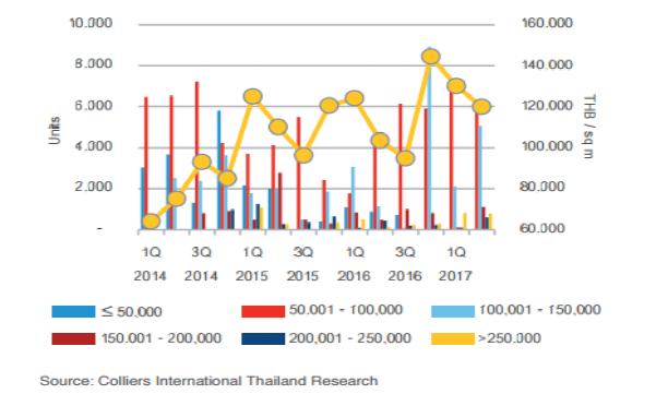 2017年第二季度新推出的公寓均价为120000泰铢/平(约人民币24000元/平),因为高端和豪华项目的减少,这一价格比上一季度下降8%。根据项目地段、项目概念以及市场定位,曼谷公寓的平均价格每季度增加约 3-5%。