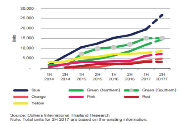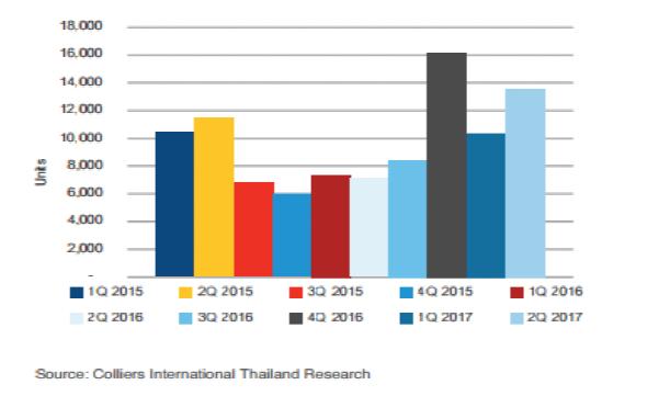 2017年第二季度比第一季度新增公寓13605套,增长约31%;该季度大部分新公寓主要集中在曼谷郊区,特别是正在建设中的轻轨如红色、绿色和蓝色线以及计划2017或2018年动工的橙色、粉色、黄色线沿线附近。