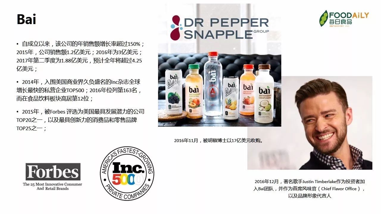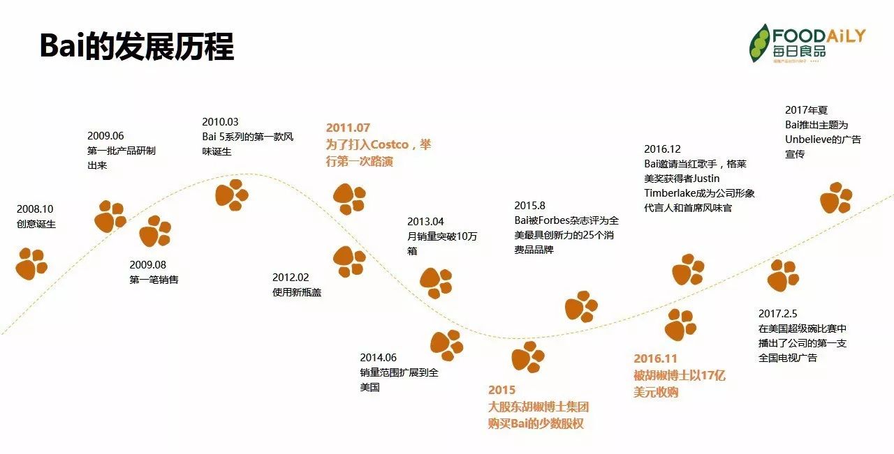 第三个节点当然就是2016年11月,Bai被胡椒博士集团收购。如同饮料行业里其他几起著名收购案,百事收购Kevita,达能收购白波一样,胡椒博士收购品牌形象更健康的Bai有助于其实现产品线的优化升级。而Bai品牌被收购后仍保持独立运营,产品的定位和特征不变,并且能够借助胡椒博士的财力,将在广告营销上投入更大。