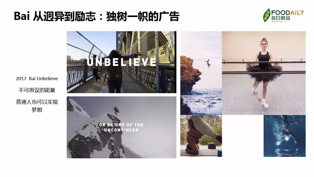 今年夏天,Bai推出了主题为Unbelieve的系列广告宣传。在一部反映普通人通过自身努力实现梦想的广告片中,Bai将品牌理念不可思议的低热量与好口味,扩展到了一个更高、更抽象的层面:在生活中,只要你不被条条框框束缚,敢于Unbelieve,不可思议的梦想就有可能实现。
