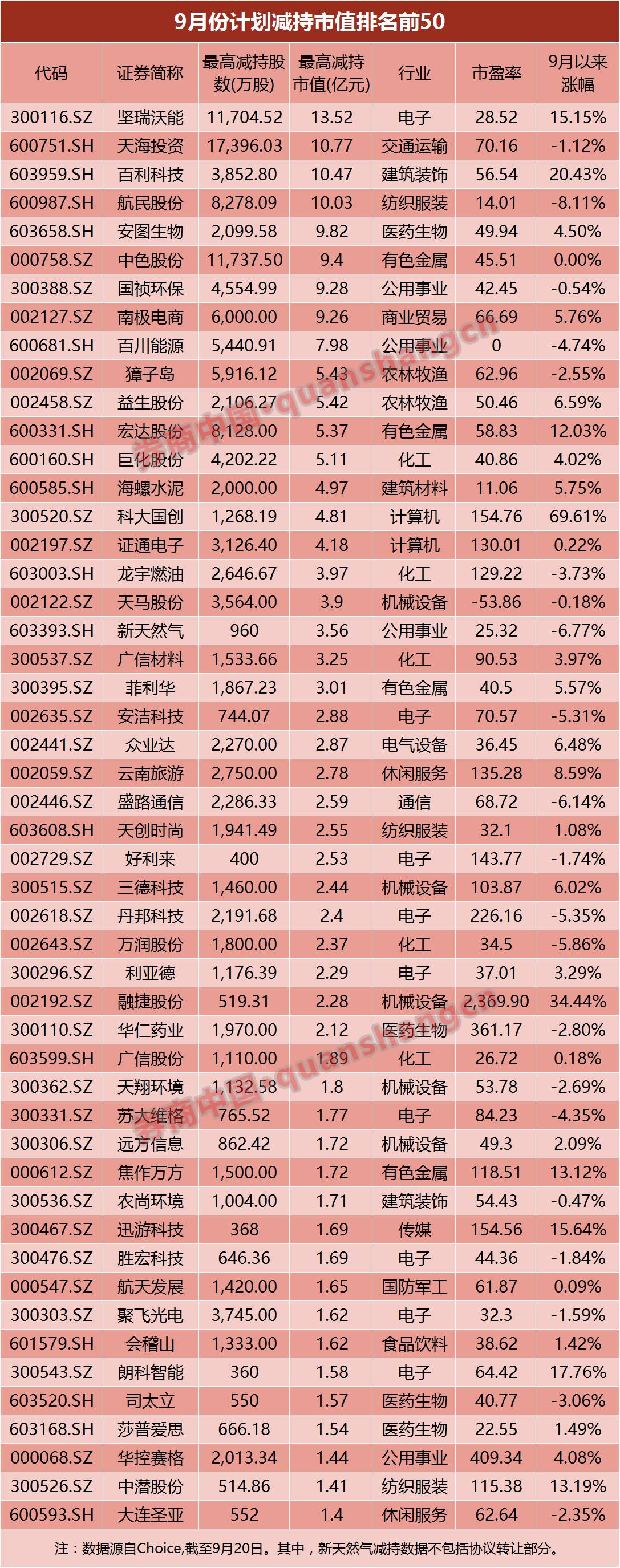 新天然气的减持计划虽然引人注目,9月份还存在更大规模的减持计划。