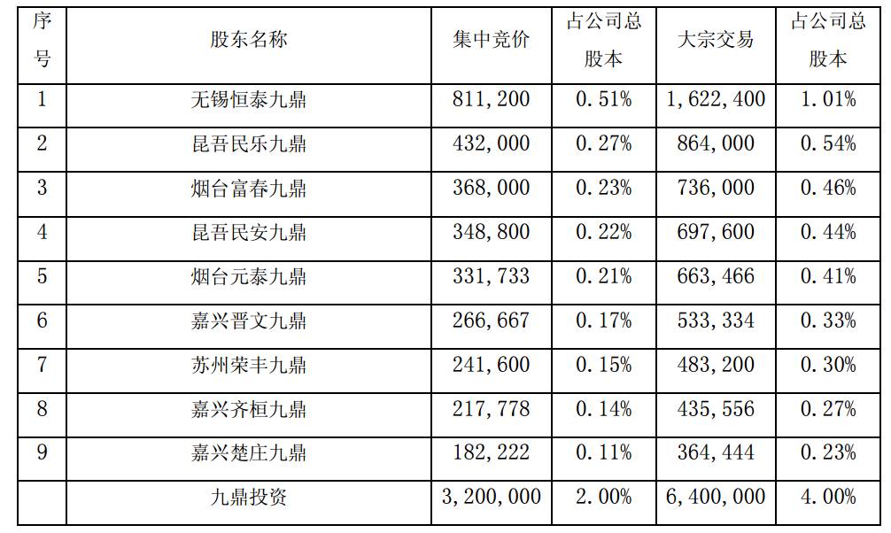 在减持形式上,九鼎投资次将采取集中竞价、大宗交易和协议转让等3种形式,其中任意连续90日内通过交易所集中竞价减持不超过公司总股本1%,通过大宗交易减持不超过公司总股本2%。