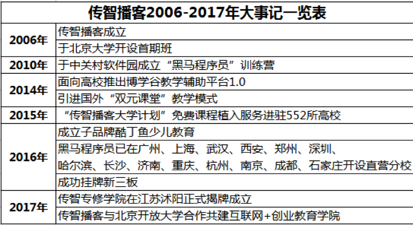 第一、按其官网所公示的信息,传智播客已经营十年有余,结合中国教育公司进入资本市场的各个时点来看,传智播客选择新三板可能非其所愿,更多地是一种曲线救国。在A股市场IPO闸门紧闭的头几年,传智播客选择进入新三板既是一种冲刺A股的蓄力,更是一种无奈的选择。