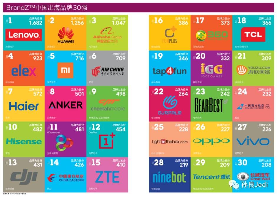 这类企业通常被称为中国互联网“出海”企业,典型案例包括猎豹移动、APUS、游族网络、Kika、Musical.ly、欧拉网络等。在BrandZ发布的2017中国出海品牌30强榜单上,部分上述企业得以入选,与国产大企业、大品牌同列。