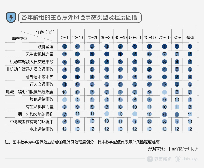 跌倒坠落是造成意外伤害风险的首要原因。根据《报告》,意外溺水或水灾,电流、辐射和极度气温损害,烟、火和火焰的损伤,中毒或者在有毒的环境中是致死率最高的意外风险事故类型,均高于60%,其中意外溺水或水灾占比更是高达96%。