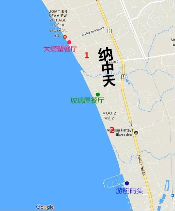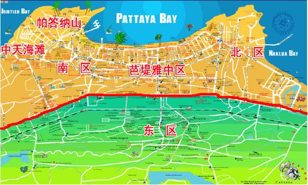先来看看芭提雅区域图,从曼谷延伸过来的高速路素坤逸路(图中红色线)把芭提雅分成东、西两部分,西芭提雅是整个芭提雅的核心部分,拥有长达15公里的海岸线,我们一般说的旅游度假、养老基本都在这里。而西区的土地价值自然也比东区高出很多,繁华程度亦不可比。整体来说,在芭提雅,越往东,土地越不值钱。下面着重讲解芭提雅各区。