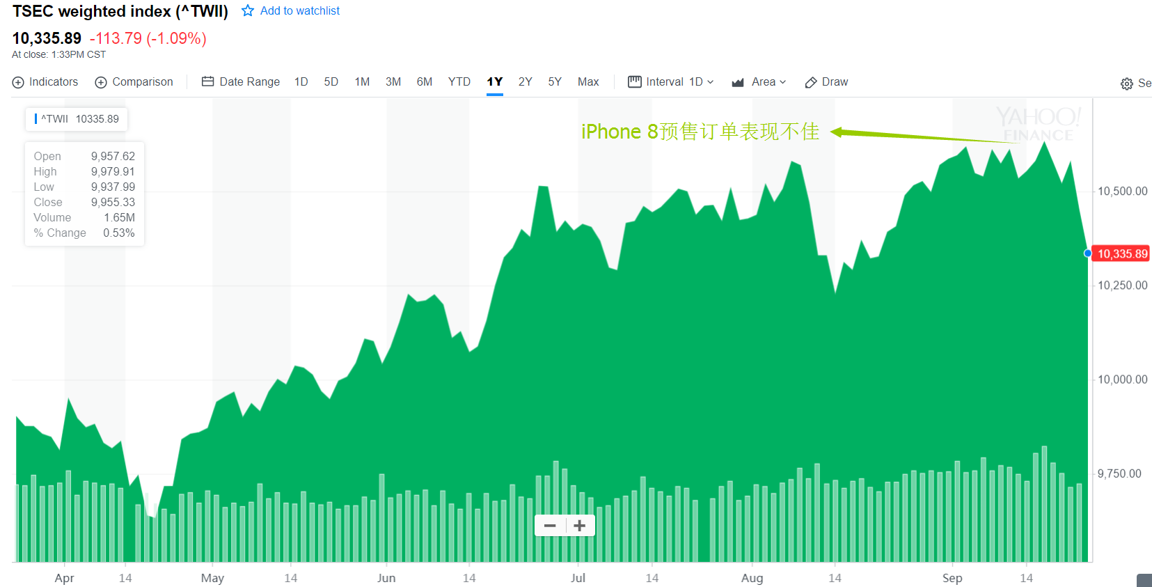 不幸的是,由于苹果概念股的权重较高,台湾股市整体都受到拖累。本周一,台湾加权指数连续第二日下跌,收跌1.09%,至10335.89点,刷新一个月最低水平,失守季线。