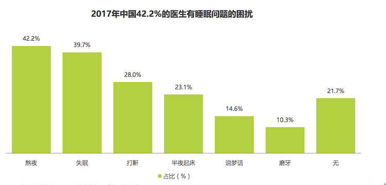 工作强度过大且生活质量较低,使得医生群体多被熬夜、失眠等问题困扰。调研数据显示,近八成医生遭遇睡眠问题,包括熬夜和失眠。42.2%的医生有熬夜习惯,39.7%的医生有失眠困扰。同时,10.7%的医生睡眠时间不足5小时,其原因多来自频繁的夜班生活。