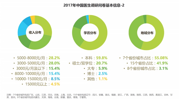 近日,实名医生平台医联联合艾瑞咨询共同发布了2017年《中国医生生存现状调研报告》(以下简称报告),对来自30个省市的医生进行调查,从工作强度、生活质量、疾病、心理压力、薪资和职业规划等多维度剖析当下中国医生的生存状况。