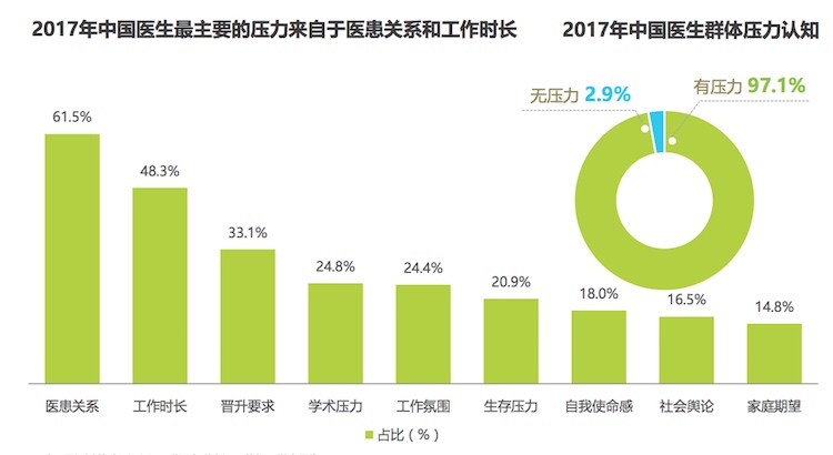 报告还表示,现阶段频发的医患关系更是加重了医生的负荷,在一系列引发医生压力的原因中,医患关系占比61.5%,高居首位。同时,29.9%的医生表示,其所处的医院经常发生医闹事件,进一步加深了医生对患者的恐惧心理。