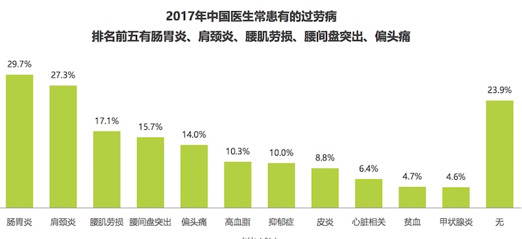 同时,报告指出2017年中国医生常患的5种过劳病,包括肠胃炎、肩颈炎、腰肌劳损、腰间盘突出、偏头痛。报告分析称,医生长期饮食不规律导致肠胃炎;长时间伏案或手术工作导致肩颈炎、腰肌劳损、腰间盘突出;因精神压力导致偏头痛、抑郁症等疾病。此外,报告还称,精神高度紧张或过度焦虑往往会引起心脑血管堵塞,也是猝死最常见的病因之一。
