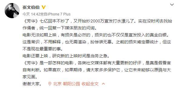 不过据透露《芳华》的成本达到了1.3亿人民币,就算没有“7亿对赌协议”,按照“最终票房是成本3倍才不会赔本”的说法,《芳华》也需要达到5亿票房以上。并且在之后网上又流传出“2000万宣发费用打水漂儿”,张文伯再次与此否认,但是从前期营销宣传,到从9月17日北京大学已经开始的几站路演,《芳华》在宣传上的费用支出必定不少,此番突然改档让前期的宣传都白费,已经支出的宣发费用确实是“打水漂儿”。