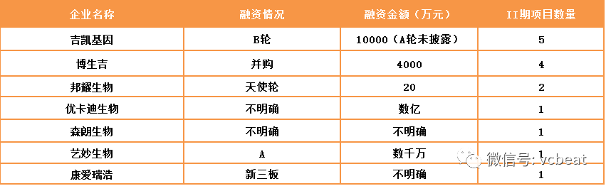 行业研究者中,尚未有企业将项目推进到III期或IV期临床。其中推进到2期的企业有7家,分别是优卡迪生物、邦耀生物、吉凯基因、博生吉、森朗生物、艺妙生物以及康爱瑞浩。