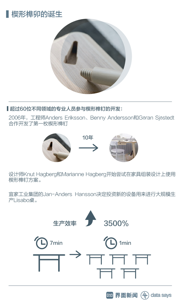 鉴于楔形榫钉对生产工艺有较高的要求,宜家工业集团加大了对旗下一家波兰工厂的设备投资。宜家瑞典总部产品线与供应链传播项目主管Angelina Ho Degerman在接受界面新闻的邮件采访时表示,新机器的投入使用使Lisabo桌子的生产效率提高了3500%,从最初的每7分钟生产一张桌子加快到每分钟生产五张桌子,显著降低了生产成本。
