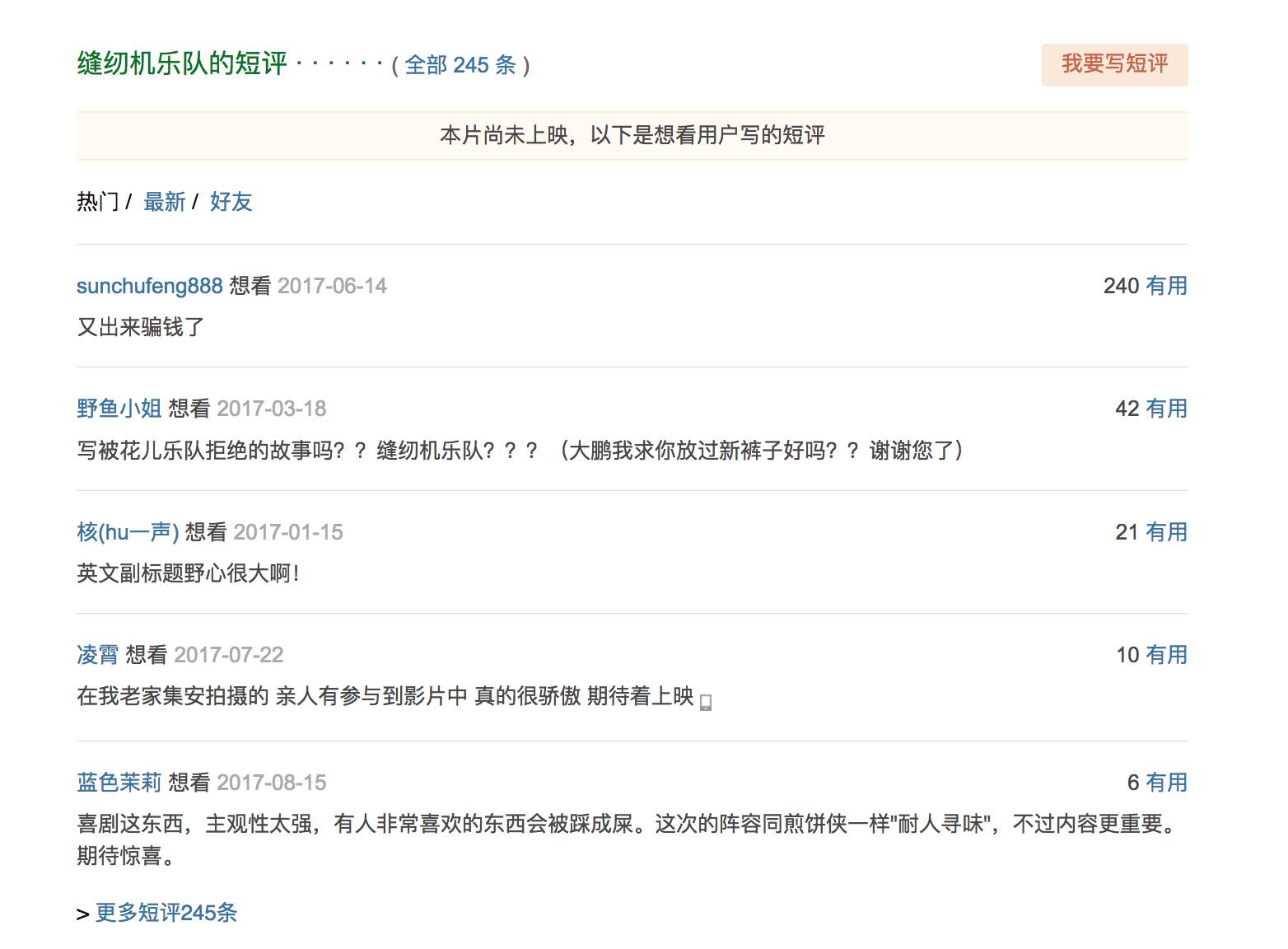 在猫眼观众评分中,《缝纫机乐队》也拿下了9.4分的“高分”,但是在豆瓣,虽然尚未评分,但在短评中好坏各异。点映被看作是电影宣发最为重要的一环,其中的评价自然需要“严格控制”。