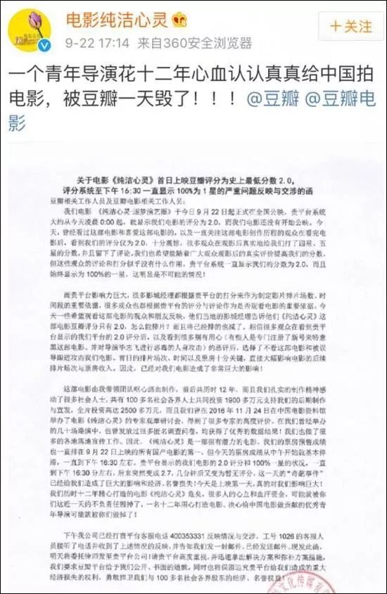 片方血泪控诉:“我们历时十二年精心打造的电影《纯洁心灵·逐梦演艺圈》危矣……一名十二年用心打造电影、决心给中国电影做贡献的优秀青年导演可能就被你们毁掉了!”