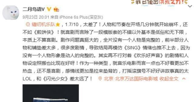 据悉,“二月鸟语”此前给还未上映的《缝纫机乐队》打了一星差评,批评《缝纫机乐队》人物和节奏在开场几分钟就开始崩坏,还不如《煎饼侠》,除了一段模版套的不错以外基本是低俗和无下限,全片没有一个人物是完整的。