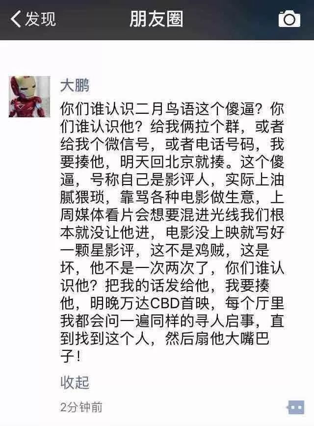 9月24日,大鹏在朋友圈里发文,直指影评人“二月鸟语”,认为其根本没看电影就恶意差评。“我要揍他,明天回北京就揍。”