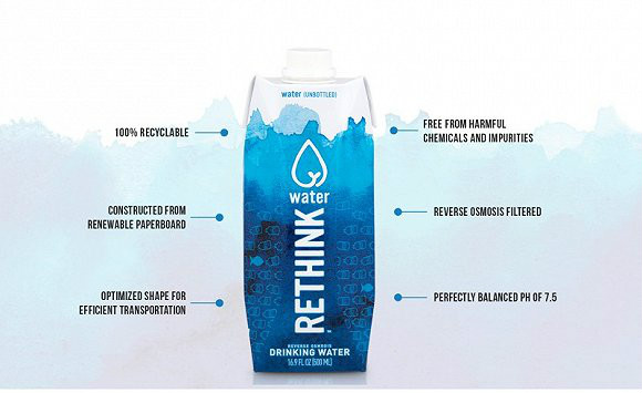 这么做的公司还有2015年成立的JUST Water和2016年新上市的Rethink Water,他们都声称自己的纸盒装更环保。