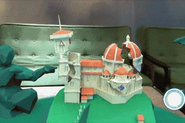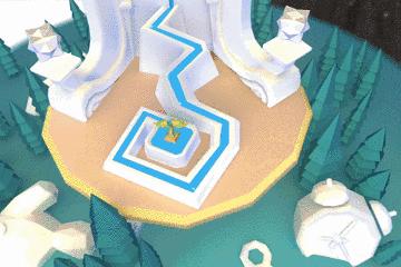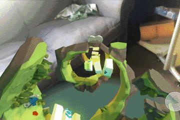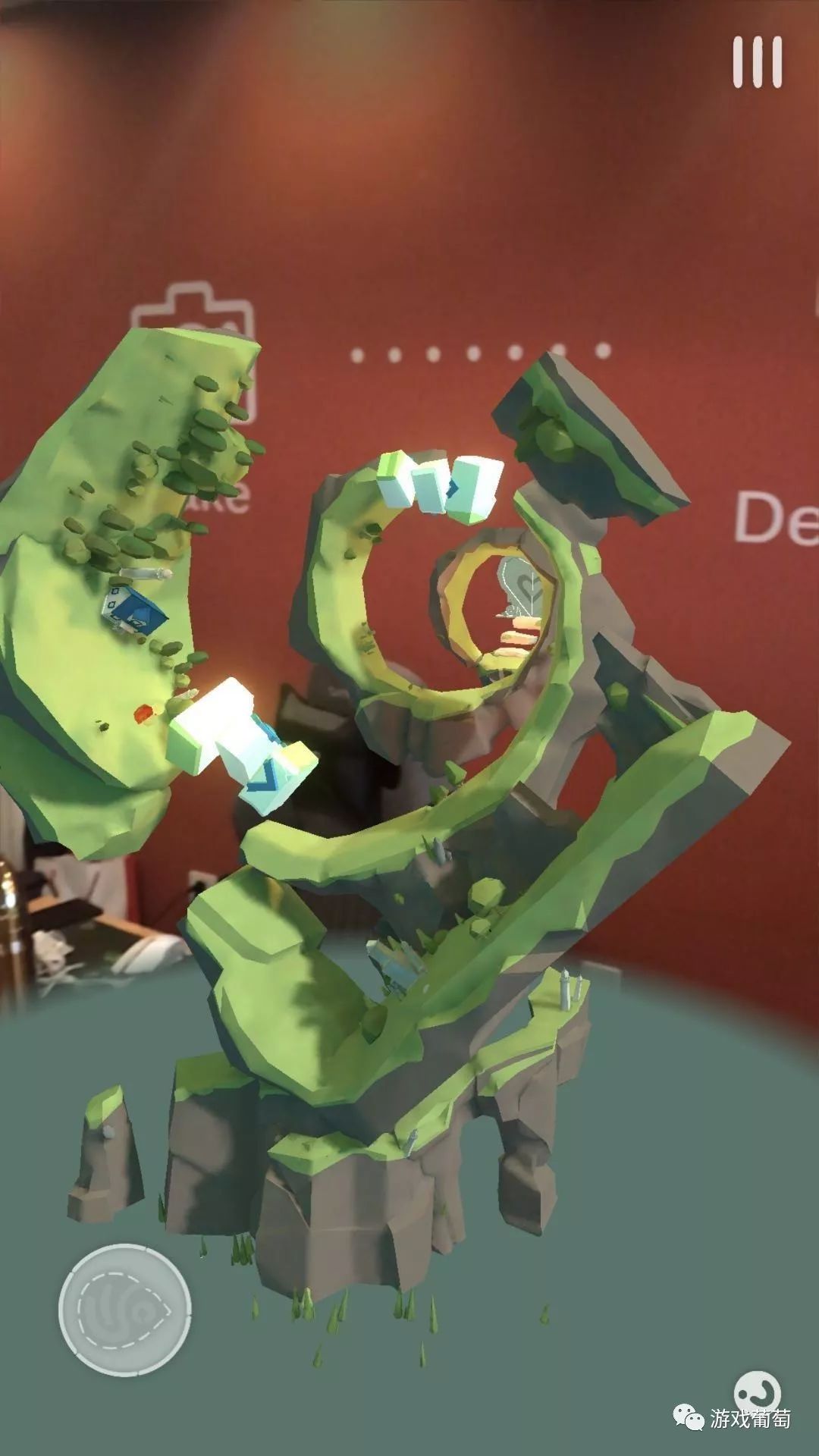 而在场景表现上,《悠梦》也做得比较出色。由于AR对性能的消耗很大,它采用了饱和度较高的低多边形美术风格,重视场景纵深,而且对物件规模的把握颇为精当。例如这个关卡就是一个向前深入的螺旋,适合玩家向前推送手机,仔细观察: