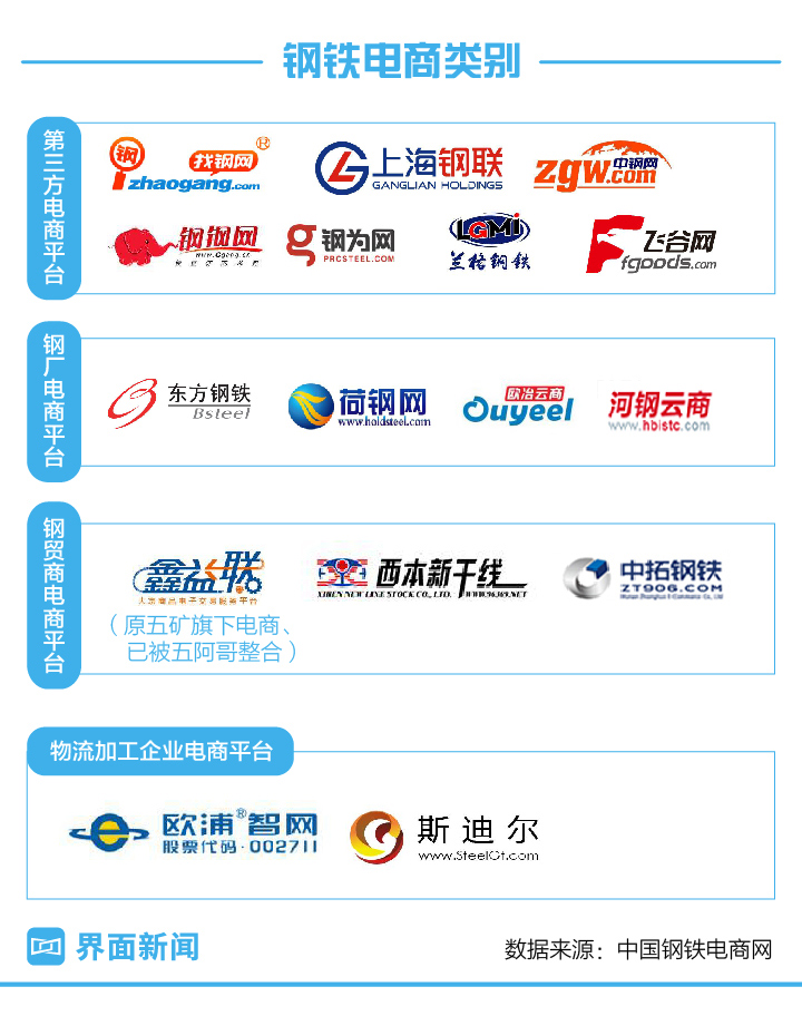 中国现有的各类钢铁电商超过300家。根据中国钢铁电商网的监测归类,找钢网、上海钢联、中钢网、钢钢网、钢为网、兰格钢铁网、飞谷网等为第三方电商平台;东方钢铁在线、欧冶云商、河钢云商、荷钢网等为钢厂电商平台;鑫益联(原五矿旗下电商、已被五阿哥整合)、西本新干线、中拓钢铁网等为钢贸商电商平台;欧浦智网、斯迪尔等为物流加工企业电商平台。