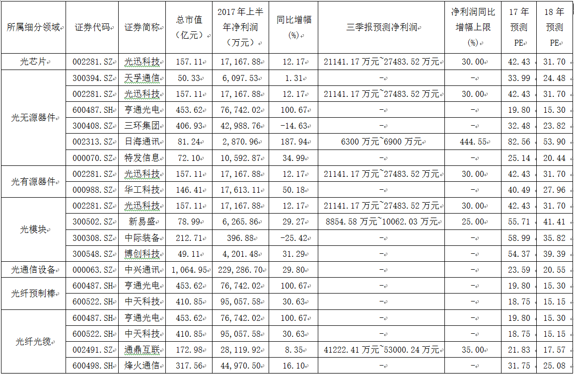 光通信产业链个股的三季报业绩预告具体情况如下表所示(下表中“预测PE”为根据多家券商一致性预测出的全年净利润及9月26日收盘价所计算出的市盈率):