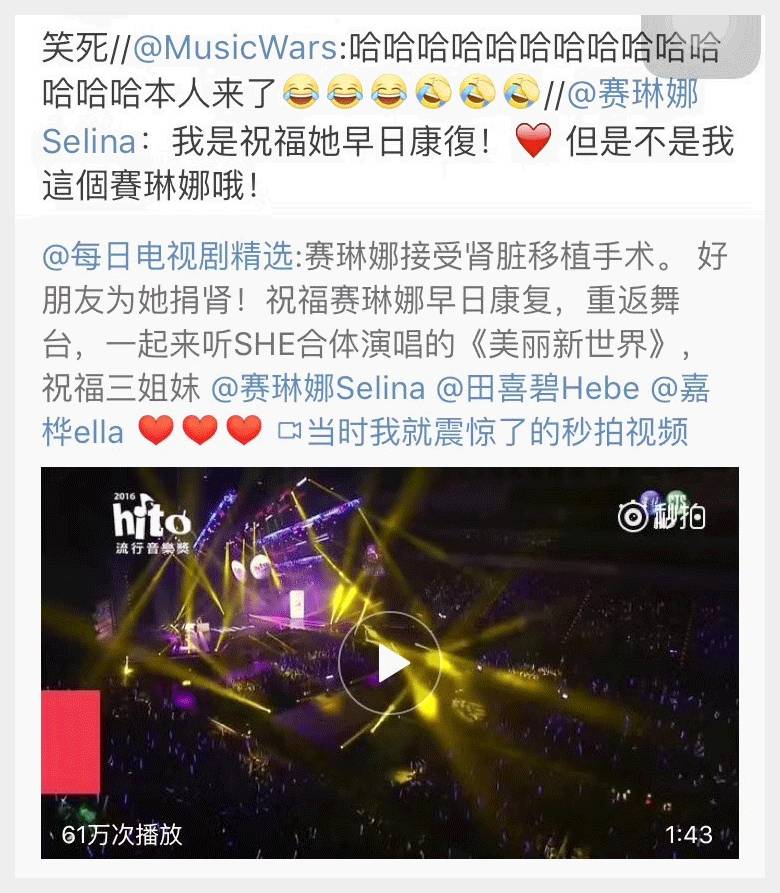 SHE的赛琳娜还亲自转发了这条微博,写道:这个赛琳娜不是我,祝她早日康复………………………………