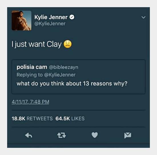这部剧反响一般,也就是连美国网红2号Kylie Jenner本人都说《13 Reasons Why》是她现在唯一看的一部电视剧。