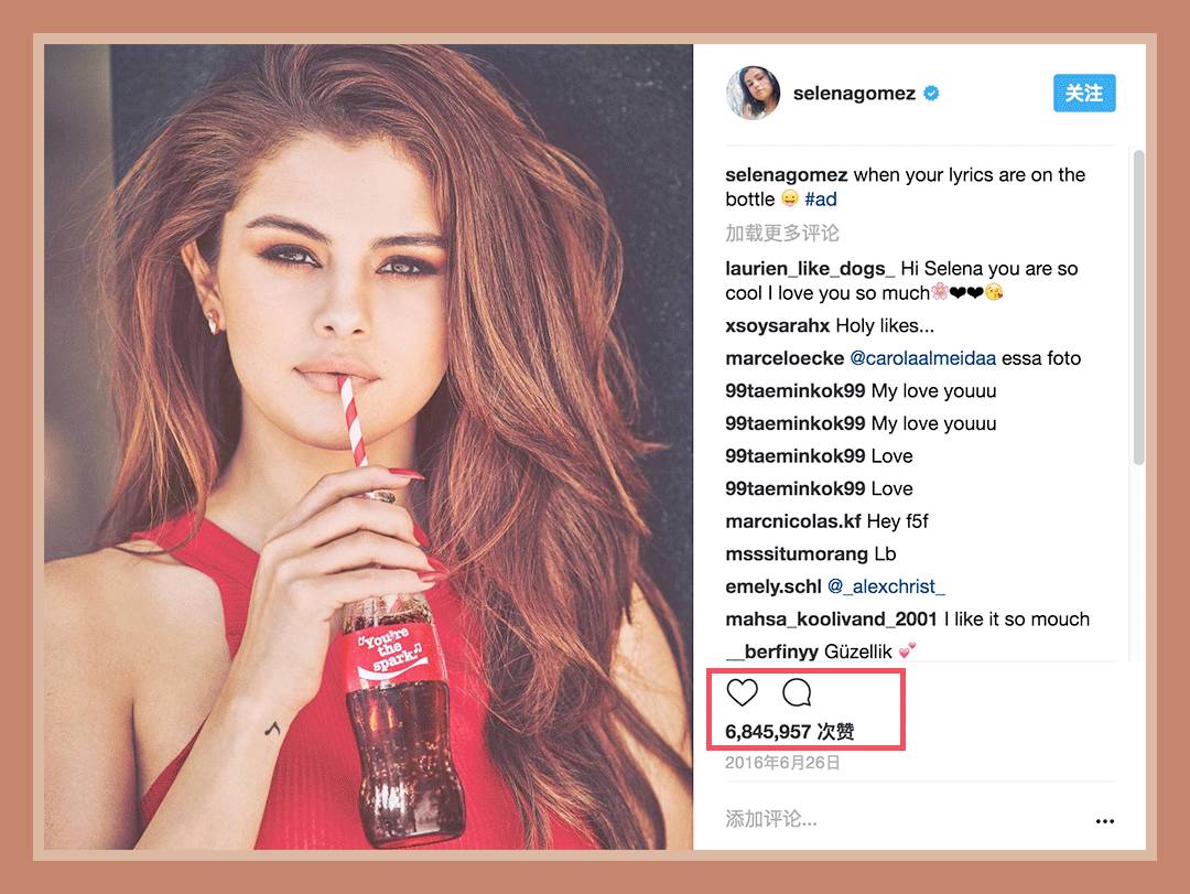 去年Instagram点赞数最高的10张照片里,光是Selena Gomez就霸占了8个名额,可以说是宇宙级网红了。
