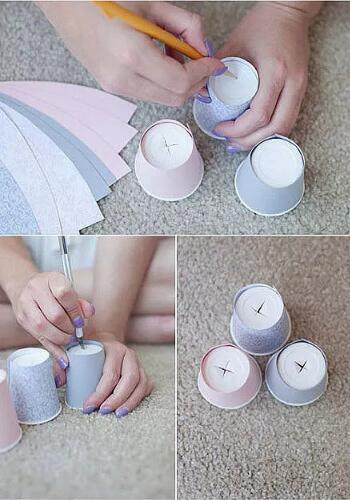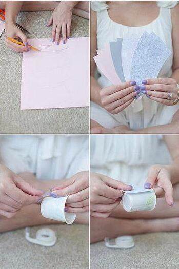 挑选你喜欢的彩纸,用笔画好草稿,按照杯身的弧度剪出一些扇形的纸片,再贴到每一个纸杯上去。