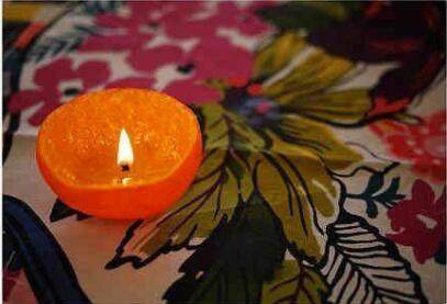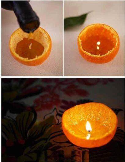 在橘子皮里放入灯芯,再倒入蜡烛油,一个小巧玲珑的创意小桔灯就完成了!
