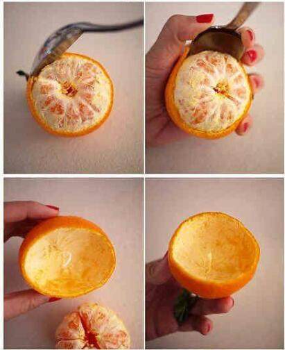 制作橘子灯需要特别的剥皮技巧~勺子就是最好的工具啦,挖出一个半圆形的橘子皮,不要客气,先把果肉吃掉~