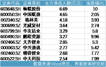 次新股午后集体拉升,畅联股份(603648.SH)获主力资金热捧,净流入6.69亿元,并以涨停报收。5G概念兴起,带动通信个股走强。中国联通(600050.SH)、中兴通讯(000063.SZ)、中天科技(600522.SH)获主力蜂拥抢筹,分别实现主力净流入4.65亿元、2.77亿元、2.54亿元。此外,周期股持续反弹,有色金属表现抢眼,格林美(002340.SZ)、华友钴业(603799.SH)、鹏欣资源(600490.SH)、天齐锂业(002466.SZ)、赣锋锂业(002460.SZ)等个股成为吸筹主力,分别获得净流入4.18亿元、3.29亿元、3.27亿元、2.85亿元、2.68亿元,其中鹏欣资源封板涨停。