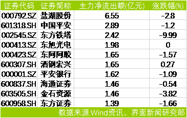 头顶“盐湖提锂”光环的盐湖股份(000792.SZ)昨日获主力抢筹后封涨停,今日却遭遇主力资金集中了结,净流出6.55亿元。盘中金融股表现低迷,中国平安(601318.SH)、平安银行(000001.SZ)、海通证券(600837.SH)、东方证券(600958.SH)均遭遇主力大幅抛售,其主力净流出额分别为2.89亿元、1.62亿元、1.46亿元、1.39亿元。值得注意的是,自9月以来,东方铁塔(002545.SZ)股价便开启了漫漫跌途,月初至今跌幅达33%,今日再度遭遇重挫,主力资金净流出2.42亿元,且尾盘遭遇砸盘跌停。