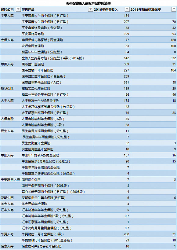 对于去年吸金的拳头产品,各家公司停售的数量各不相同。除了上述三公司前五产品悉数停售外,国联人寿、中英人寿、工银安盛人寿、天安人寿、汇丰人寿、中邮人寿、民生人寿、中国人寿、太保人寿、平安人寿十家保险公司停售数量也达到了四款。