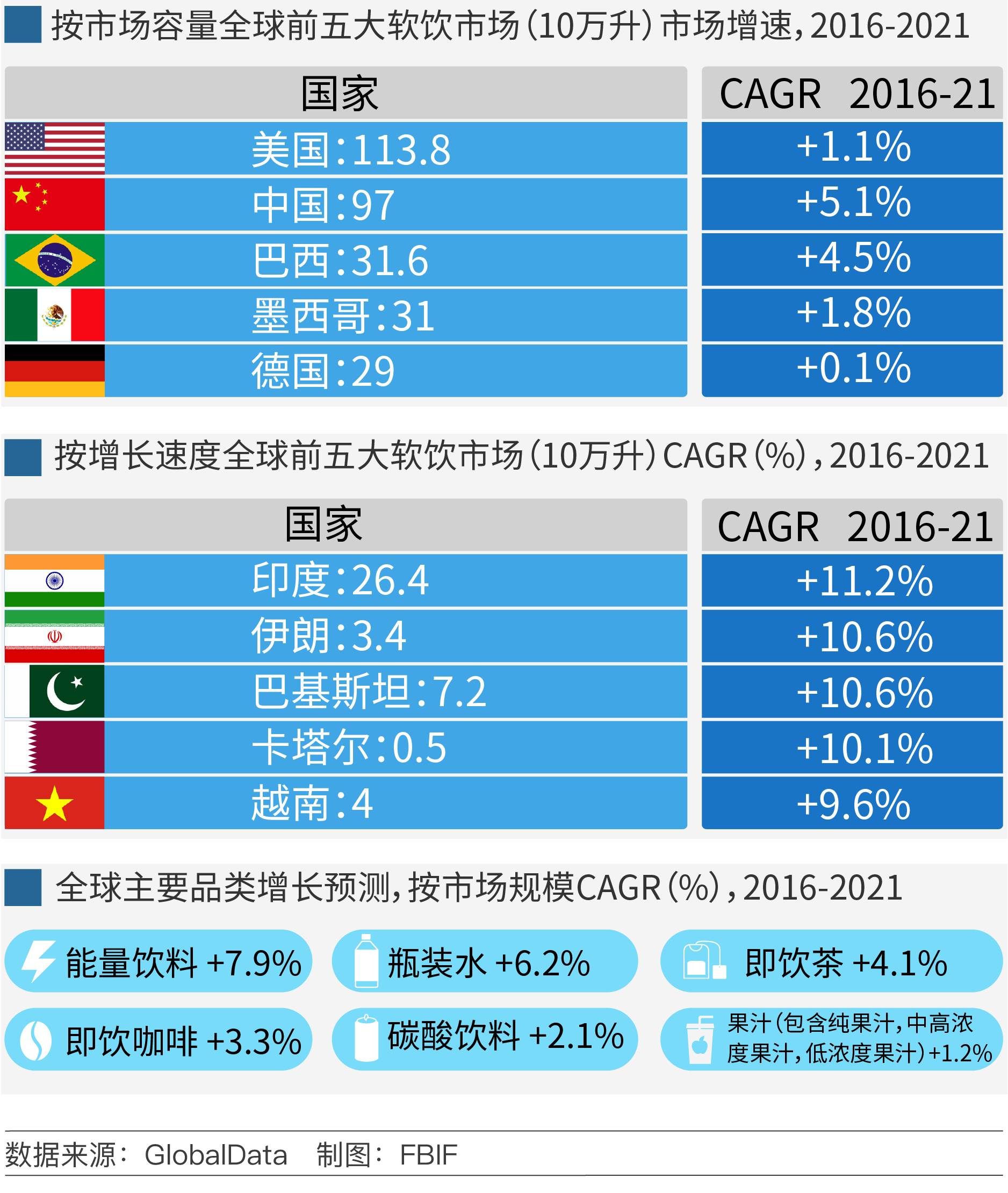 根据Global Data《2017全球即饮软饮料市场7大创新趋势》报告指出,美国、中国、巴西、墨西哥、德国是全球前五大软饮料市场,其中中国市场达到970万升,并且在未来5年将仍会有5.1%的增长。
