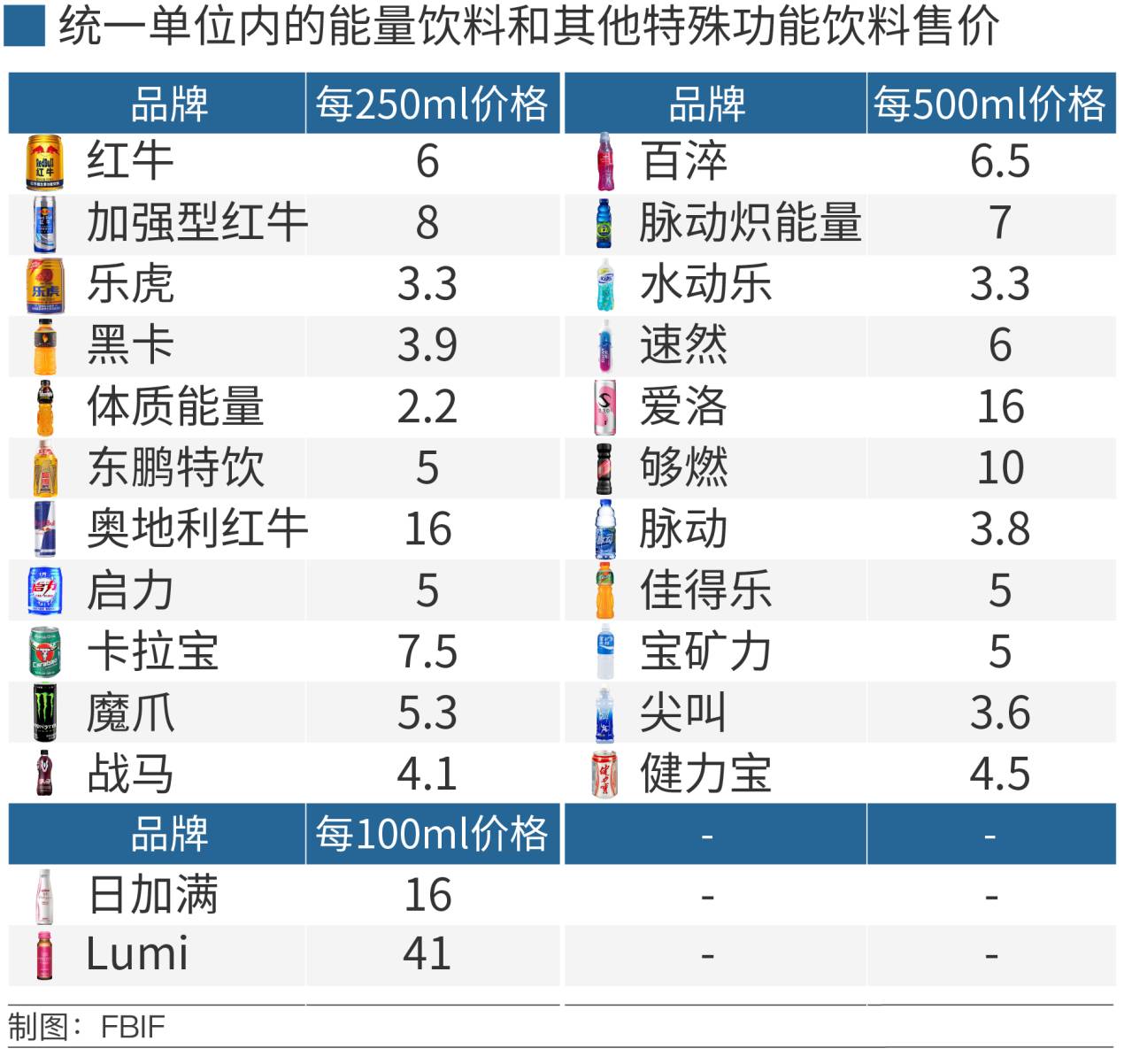 我们通过天猫旗舰店对市售能量饮料和其他特殊功能饮料在统一单位内的售价进行了调查,通过下表可以非常清晰地看出各品牌的价格策略。