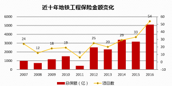 近十年,特别是2012年以来,地铁项目投保数和保险金额基本呈逐年上升趋势,2016年地铁工程保险项目达到54个,总保额超过5000亿元。