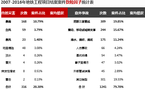 从结案案件致险因子来看,意外事故占比近80%,自然灾害约为20%。意外事故中,挖断三者管线、震动移动或减弱支撑、涌水涌砂涌泥为主要原因;自然灾害中暴雨、台风和暴风居于前三。