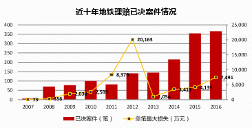 2012年以来,地铁工程险已决案件呈逐年上升趋势,尤其是2015、2016年,基本每天结案1起,十年间共结案近1600起,客户报损获赔率超90%;上述案件中,平安主理赔案件近600起,主理赔率约37%,远高于首席项目占比;其中单笔最大赔款为某城市盾构机涌水涌沙事故, 单笔赔付金额超2亿元。