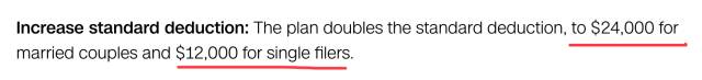 标准扣除额度的提升也意味着$12000和$24000收入以下的单身和家庭将不用交税。