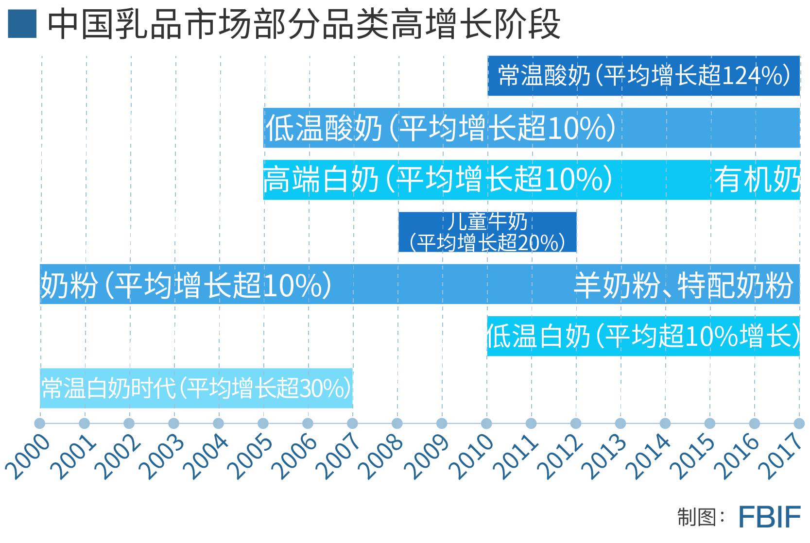 商业发展的动力是分化,分化诞生新品类,新品类的不断崛起才是推动乳品行业不断增长的源动力。我们根据不同品类的高速增长阶段,画出下图,可以看出不同阶段始终有不同的品类在主导乳品行业的增长。
