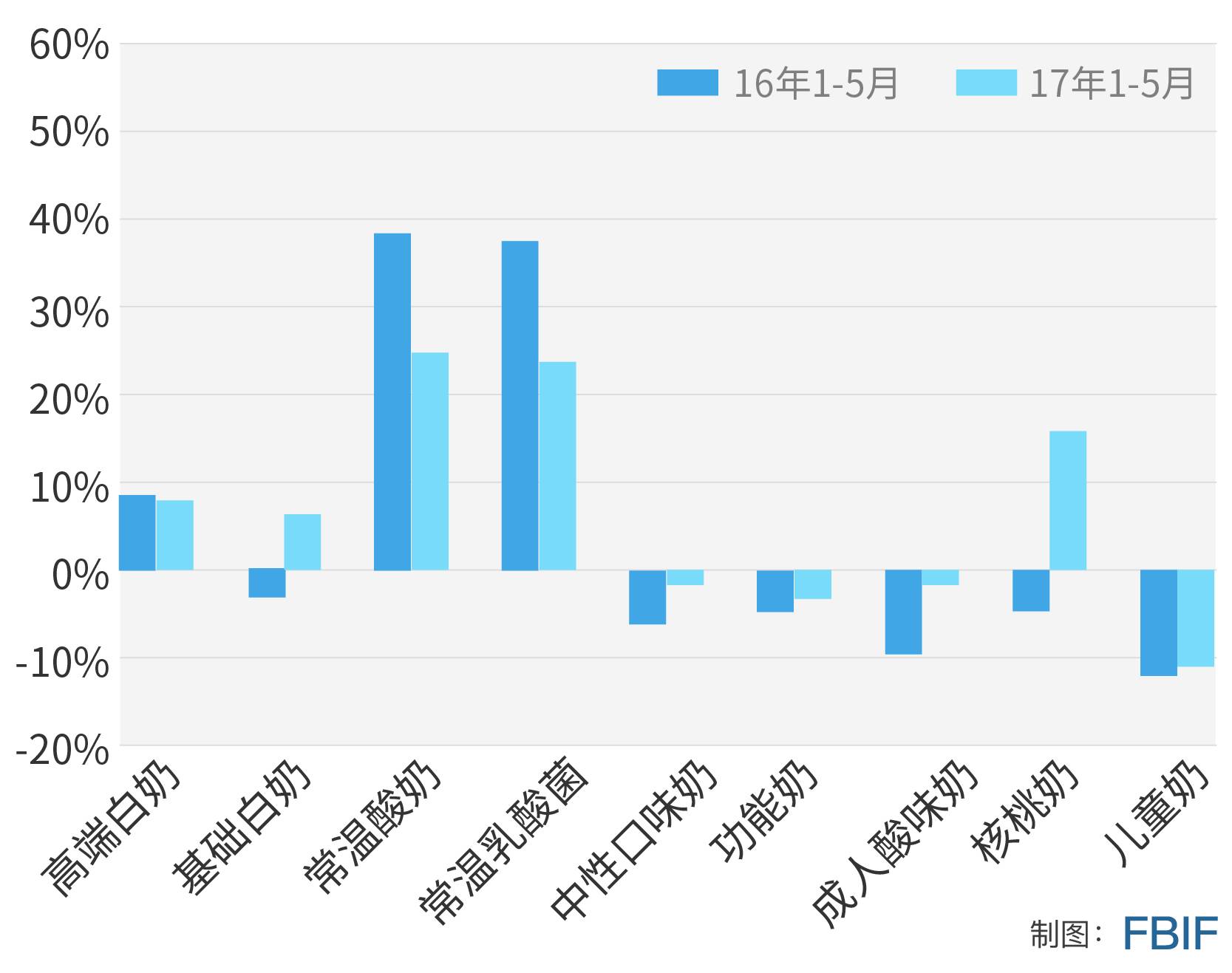 在2010年到2017年期间,常温酸奶的年均复合增长率达到93.21%。进入2017年虽有回落,但在2017年 1-5 月同比增长仍然高达32%[11]。