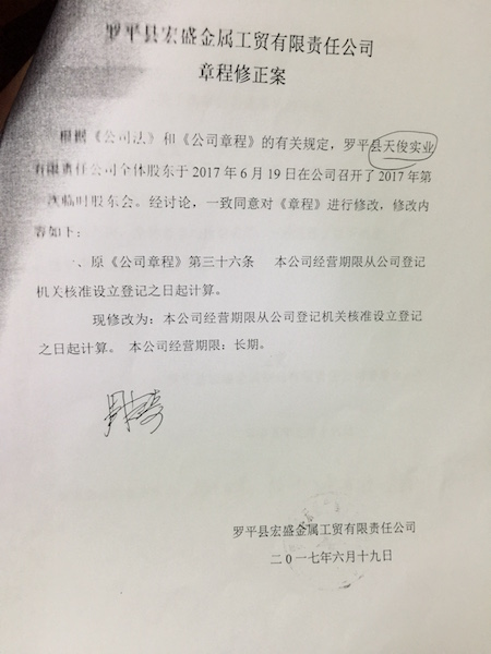 界面新闻记者获得了一份2017年宏盛金属的公司章程修正材料,其中提到该修正案是天俊实业全体股东讨论后形成的决议。