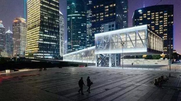 陆家嘴展览中心在周围成群的金融写字楼之中,融合休憩、活动(针对电影放映、时装秀以及音乐会)的功能,成为黄浦江畔备受欢迎的公共建筑。大都会建筑事务所表示:建筑的物质性与建筑本身都在与地块的过往对话。比如在“方块”建筑下的广场,由于近江部分无其他钢柱支撑,人们的视野不被阻滞。