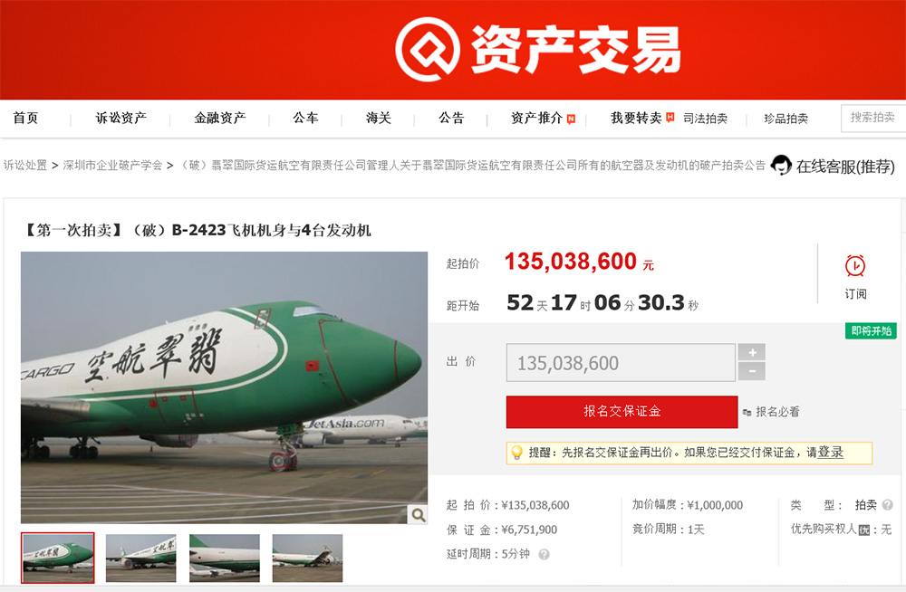 资料显示,这三架飞机都来自于翡翠国际货运航空有限责任公司(下称翡翠航空),因为债台高筑又无人接手,公司进入破产清算程序,而其所有的三架波音747也随之被拍卖,因为线下多次流拍,因此才转移至线上,三架飞机的起拍价超过3.9亿元,最便宜的一架为1.2亿元。