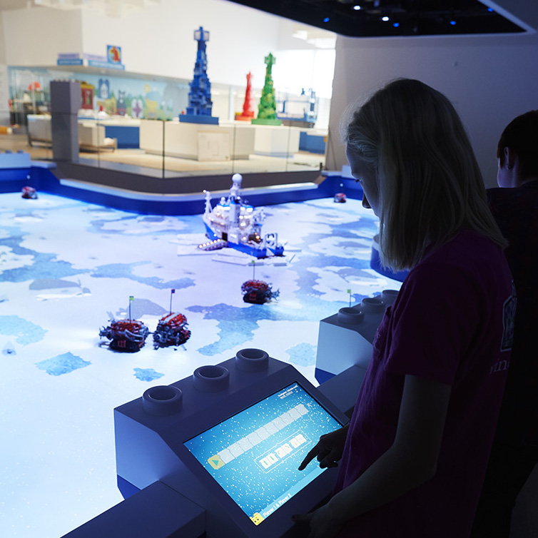 在蓝色区域的Robo lab里,小朋友们可以通过和LEGO Boost产品相似的玩乐方式,来控制乐高积木拼接成机器人来营救被冰雪困住的乐高小人——你可以通过方向和喷火、冰冻等方式控制机器人,而在机器人则在一个智能投影的平台上运动,平台上方的感应器可以知道机器人的动作,从而在投影画面上作出反应。