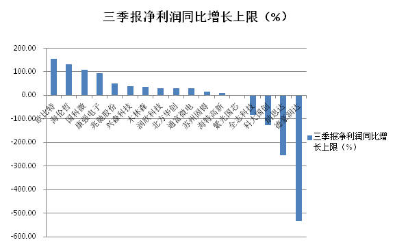 从目前已经公布的三季度业绩预告来看,19家公布的公司中有14家公司归属于母公司股东净利润(下称净利润)同比增长上限为正,其中欧比特(300053.SZ)、海伦哲(300201.SZ)和国科微(300672.SZ)的同比增速均超过了100%,分别达到154.19%、131.36%和107.63%,位居前三位,而德豪润达(002005.SZ)、纳思达(002180.SZ)以及科大国创(300520.SZ)则分别下滑533.10%、255.51%和126.25%,位居最后三位。